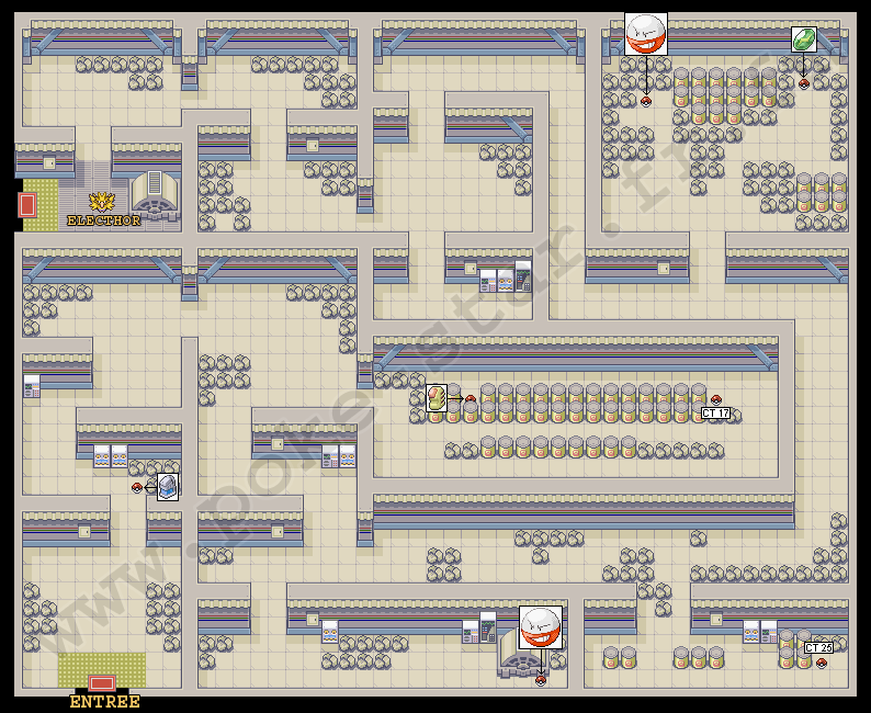 L'intérieur de la Centrale abrite des Pokémon de type Électrique entre les niveaux 22 et 35 : Voltorbe, Pikachu, Magnéton et Elektek sont les plus fréquents. Soignez votre équipe avant d'aller plus loin si ce n'est pas déjà fait.