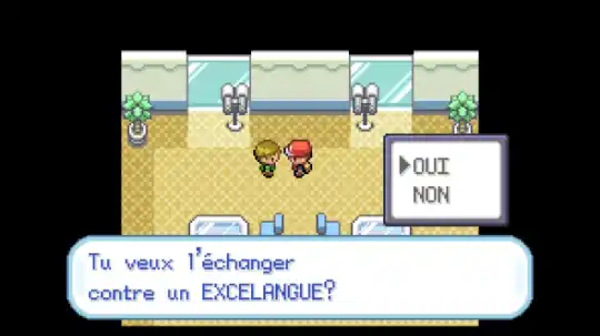 Entrez dans ce bâtiment et montez à l’étage. Un dresseur vous proposera alors un échange :