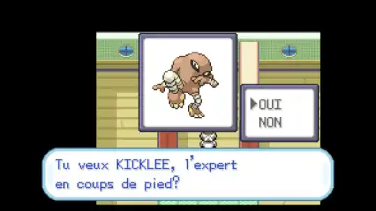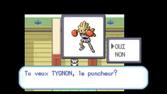- Les deux Pokémon sont obtenus au Dojo de Safrania après avoir battu tous les dresseurs et le maître du Dojo.